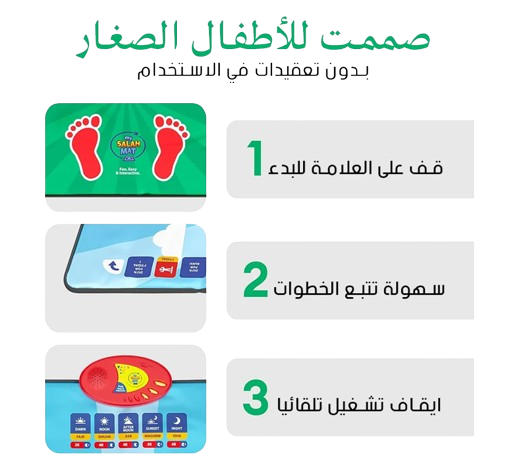 تتعرف السجادة على الضغط في مواضع القدمين، الركبتين، اليدين، والرأس، وتُشغل التعليم الصوتي المناسب لكل مرحلة